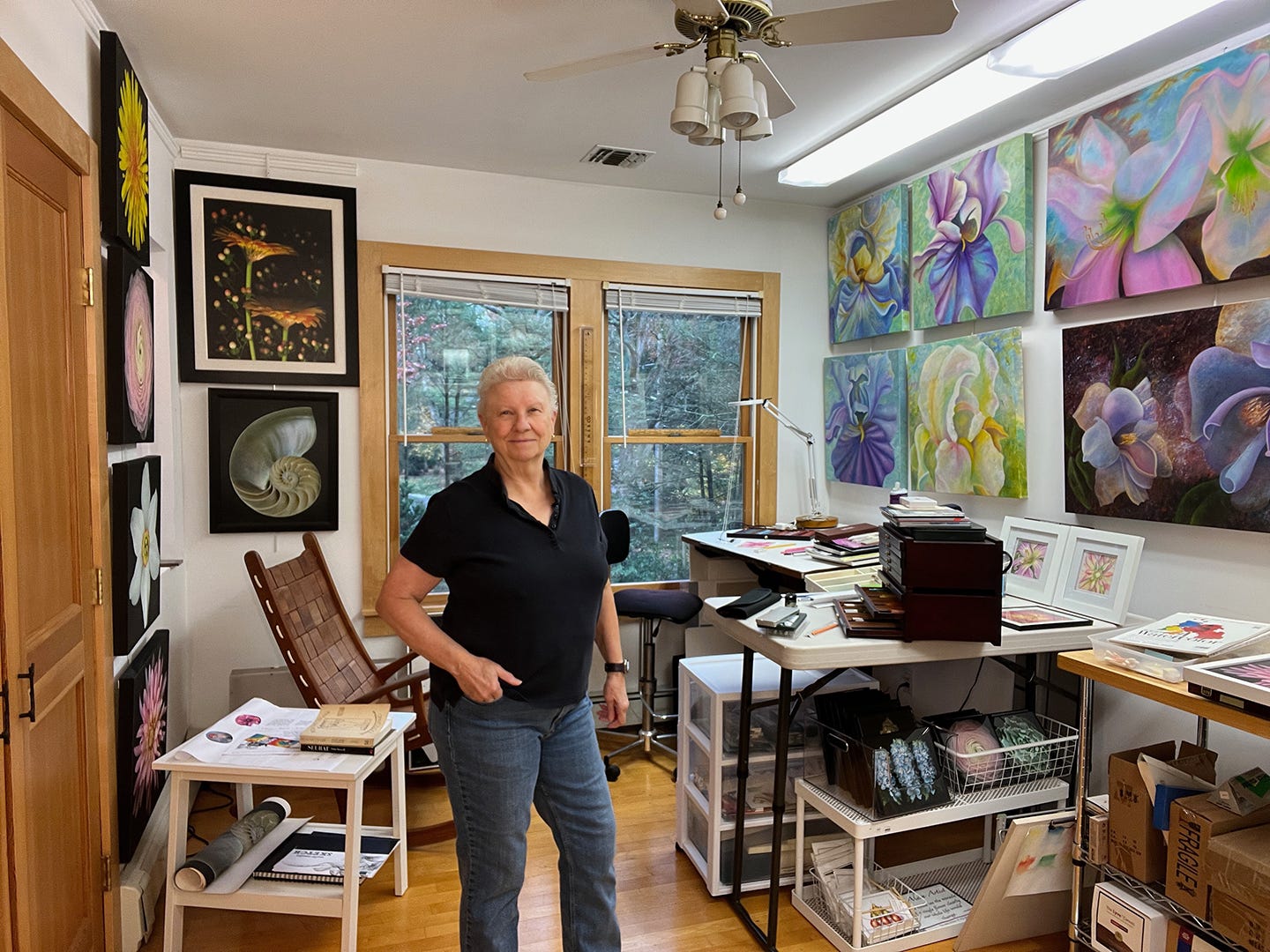 Most days, I wake up without an alarm, and before I get out of bed, I enjoy a 30-minute stretching and meditation routine. Then I shower, have coffee & read the news on my laptop. Each day that the weather permits, I spend time in my garden either working, photographing, or just seeing and enjoying. By mid-afternoon, I head to my studio for hours of painting or drawing.